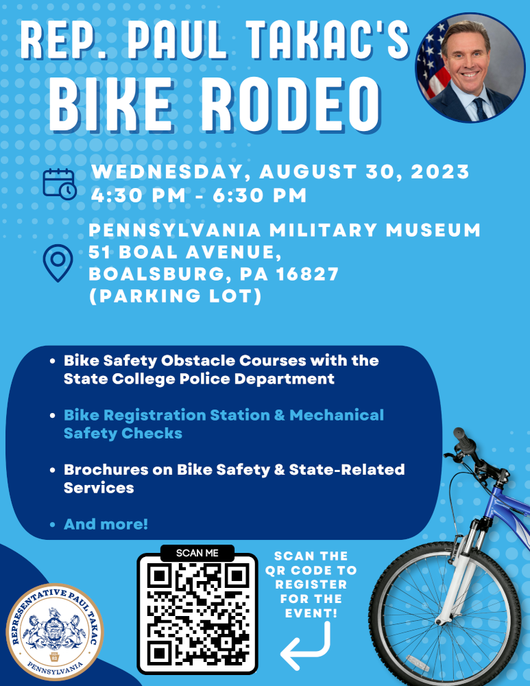 There will be a Bike Rodeo on August 30th from 4:30-6:30pm at the Pennsylvania Military Museum in Boalsburg! Join Rep. Paul Takac , State College Police Department , and other community partners for a fun filled evening of with bike safety skills, bike tuning, helmet fittings, and meet local local organizations and vendors in our area. See you there!!