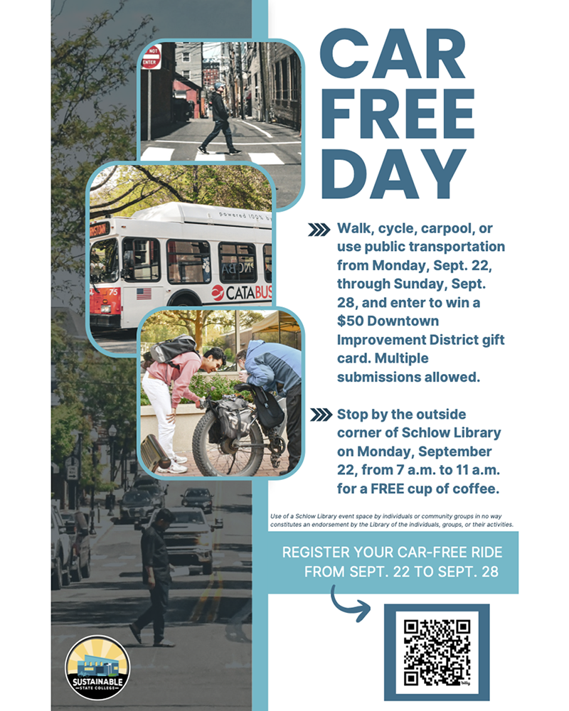 Celebrate Car Free Day on Monday, September 22, by walking, biking, carpooling, or using public transit for a chance to win a $50 Downtown Improvement District gift card! Stop by the outside of Schlow Library (corner of Allen Street and Beaver Avenue) between 7 a.m. to 11 a.m. for a FREE cup of coffee