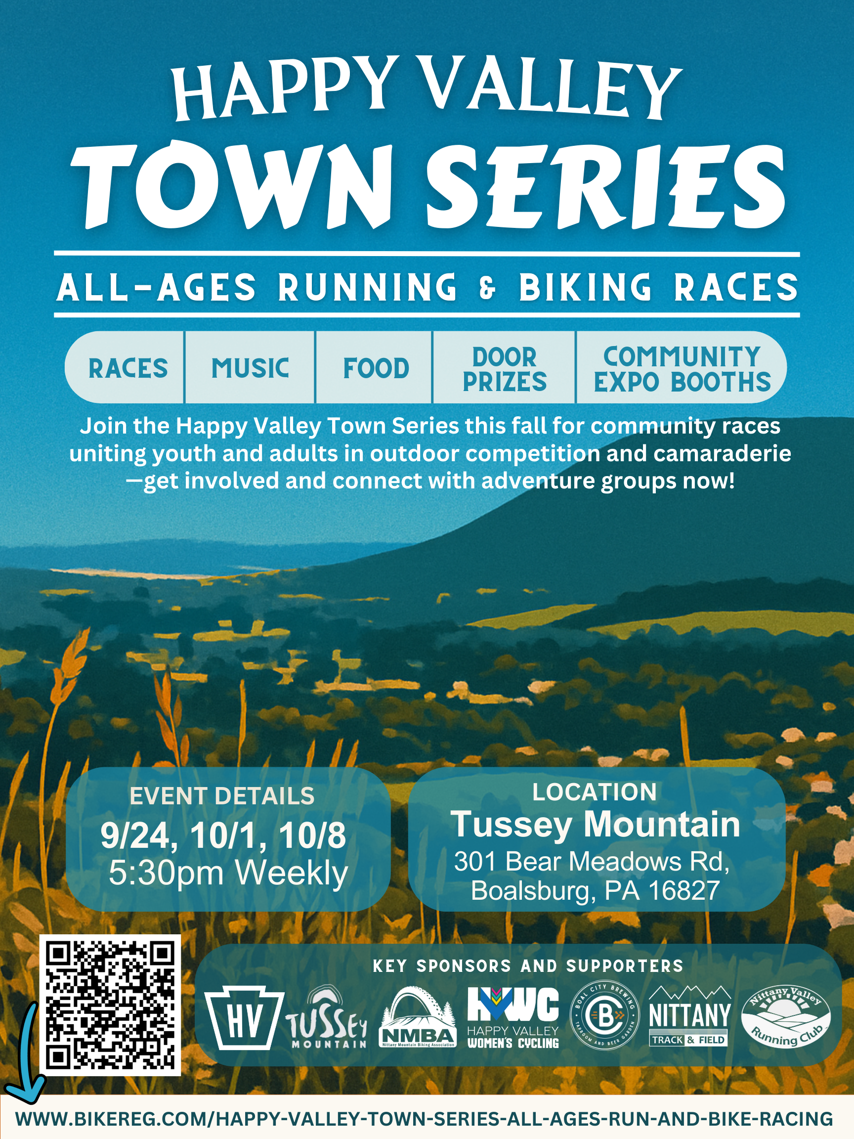 Join us for the first-ever Happy Valley Town Series—a one-of-a-kind community event bringing youth and adults together for short-course running and biking races, live entertainment, and family fun under the lights at Tussey Mountain.