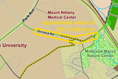 Closeup of East side access on Puddintown Rd. Path will follow PSU field fence over to Orchard Rd